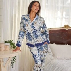 Women’s Pajamas Lounge Set, Long Sleeve Top And Pants With Pockets, Viscose Pjs Floral Flowers