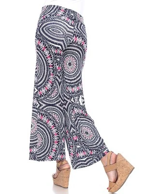 A throwback to an iconic style, this geometric print palazzo flowing ensemble makes a statement each step you take. A simplistic silhouette with a mid rise elastic waistband with tummy control and wide legged straight cut. Thin yet durable polyester blend fabric with retro print with an amazing stretch and flowing fit. Easy to wear for formal and special events, loungewear, and flexible enough to use during a yoga session. Sizes ranges from small to extra-large with an inseam of 31 inches.