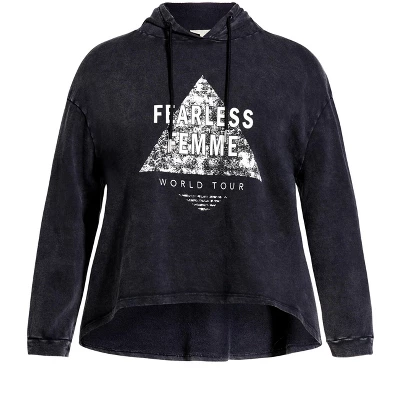 Show off your fearless style in the Lila Crop Graphic Hoodie. This flattering shape shows off your figure without clinging, while the black wash brings a grunge-inspired feel to any look.Societie+ is the youthful urban aesthetic youre looking for, with tops, denim and cozy loungewear to add to your everyday wardrobe. This streetwear inspired label is designed with your curves in mind, ensuring effortless off-duty style comes with ease. Edgy, playful and packed full of attitude, Societie+ does casual styling oh-so-right. A youth brand designed to love curves, Societie+ offers distressed denim, playful dresses, loungewear and more. Off-duty and on-trend, find your perfect OOTD with Societie+! Available in sizes 12 – 32.