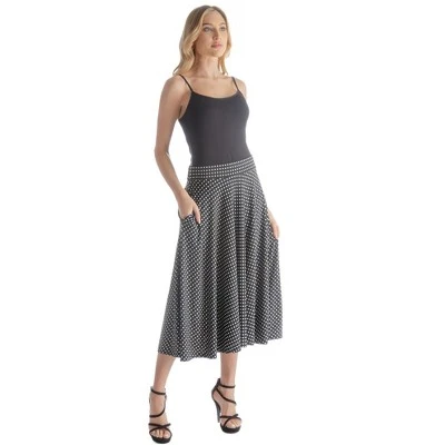 Elevate your style with the Navy Polka Dot Pleated Pocket Midi Skirt from 24seven Comfort Apparel. This flirty and feminine skirt features a playful navy polka dot print on a soft and flowy fabric that will flatter your figure. The skirt has a classic midi length cut and is designed with a pleated waist and pockets that add a touch of elegance and practicality. The elastic banded waistband ensures a comfortable fit that will keep you feeling great all day long. Whether youre headed to work or a night out with friends, this skirt will have you looking and feeling your best. The playful polka dot print and flowy fabric make it perfect for any occasion.